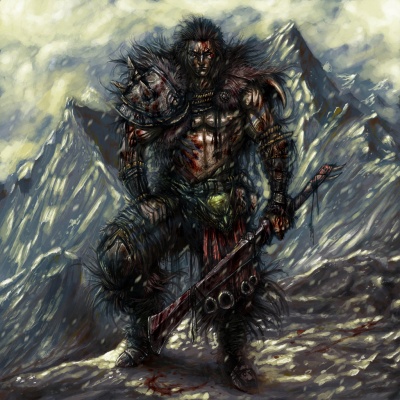 Long somewhat curly hair flows down a gaunt face, which is perpetually painted in blood now. He wears rich purple. He has strange black tattoos all over himself.