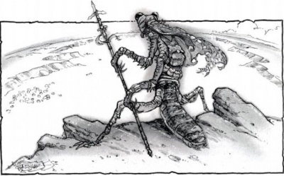 Years later, seeing the power of the son of Cassander, A'ket'k suddenly grew very interested in Tomak, and would spend many hours with him along silt shoals and beaches, wading through the stuff, for only the two could easily breathe in such dusty places. A'ket'k told Tomak of the spirits of the silt that the thri-kreen believed granted Tomak's powers, and said that one day the Silt Sea would rise to engulf Balic and then eventually all the world. The evil thri-kreen counseled Tomak to leave the company of his father and come with him back to the deep silt sea and come before the Old Man of the Sea, who alone could give Tomak powers over the silt such as A'ket'k possessed.